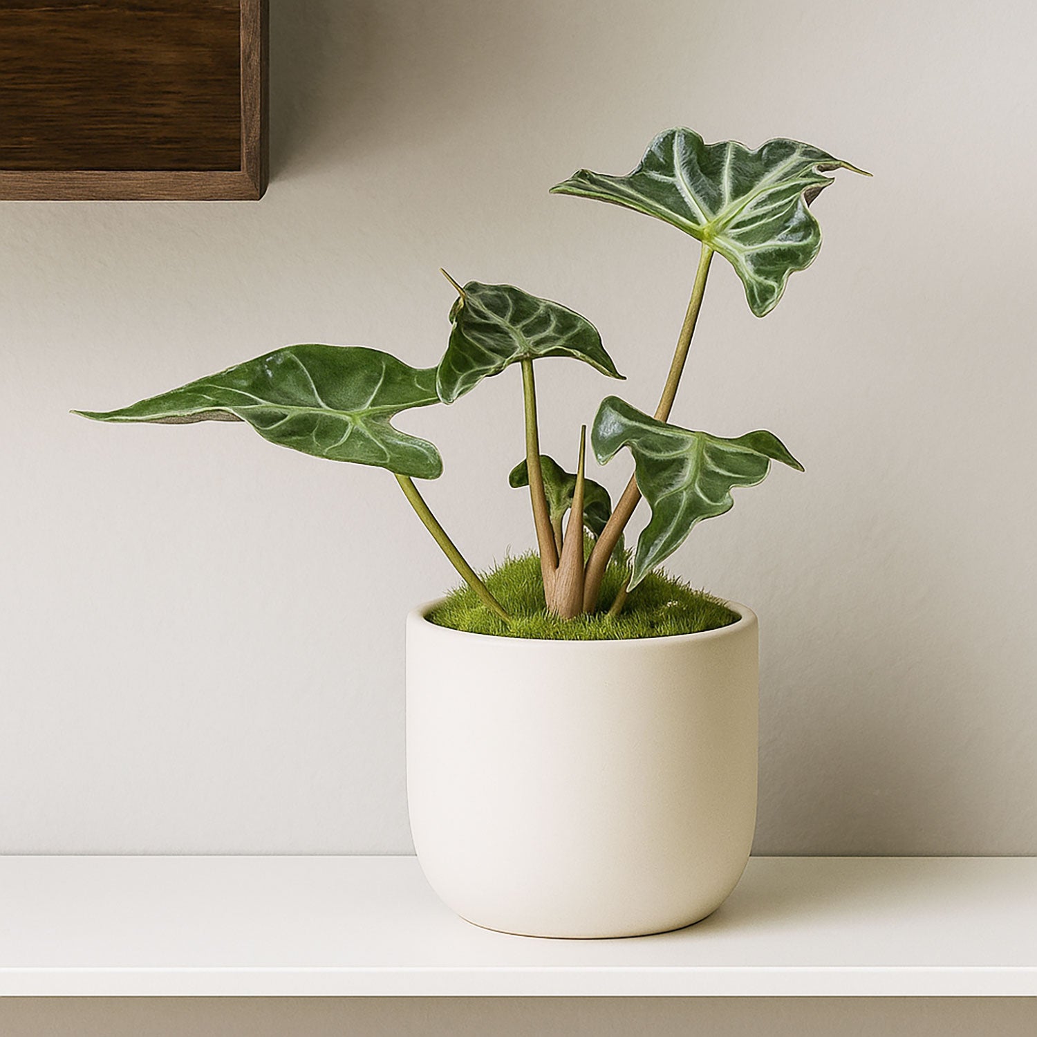Small but dramatic, this extraordinary species brings a jewel-like intensity to any indoor plant collection — a true conversation piece that embodies the elegance of the Alocasia genus.