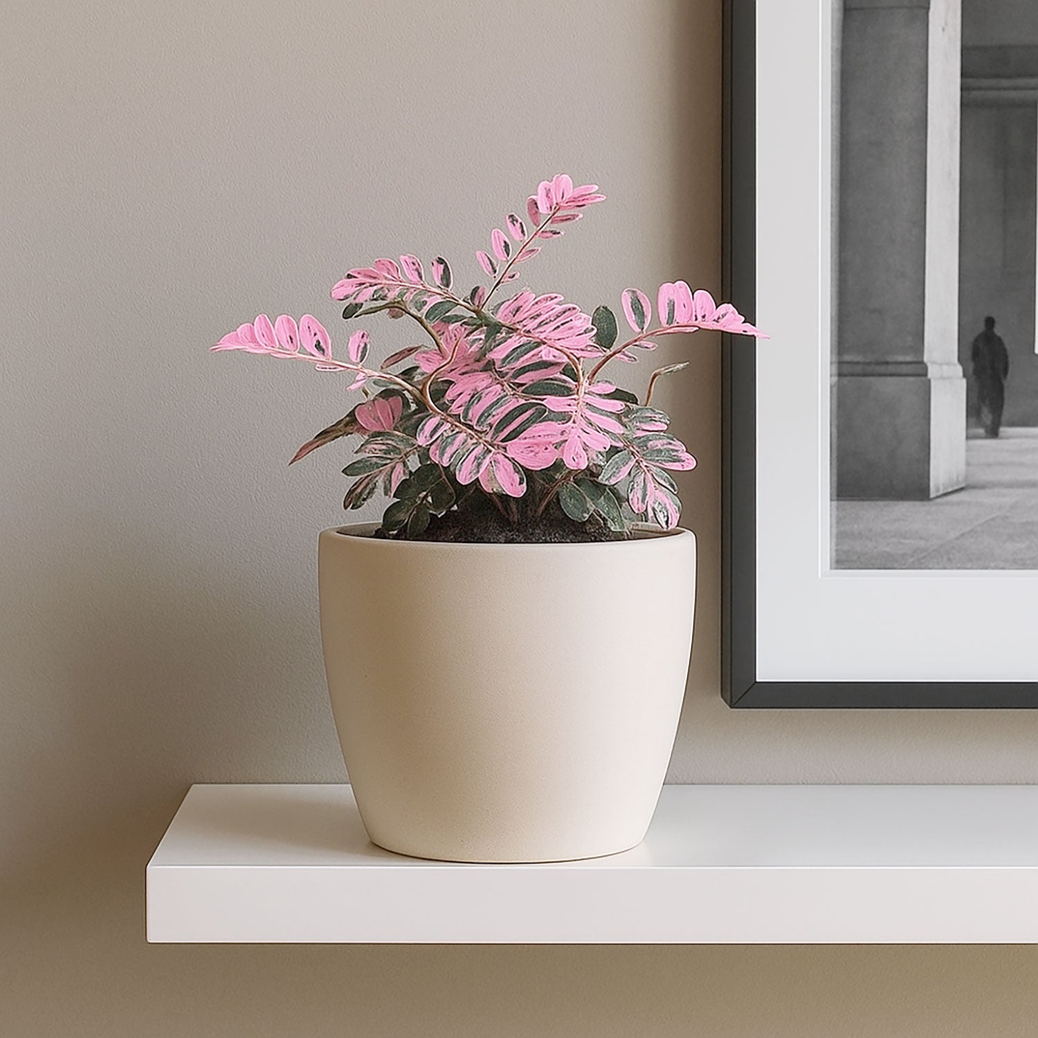 Unlike its wild, weedy counterpart, the ‘Compacta Variegata’ cultivar features tightly arranged leaves with stunning cream, pale green, and light pink marbling. Each slender stem bears alternating, delicate leaflets resembling tiny ferns, creating a soft, symmetrical appearance. Compact in form and vibrant in colour, it brings a gentle, almost ornamental grace to any tropical plant display.