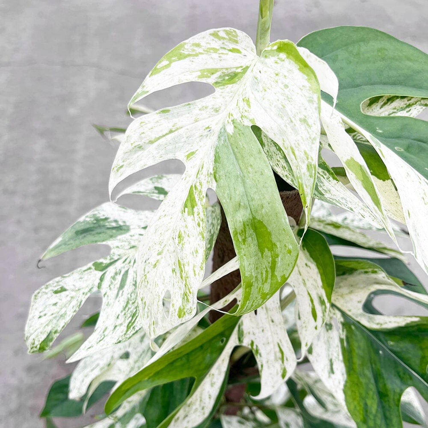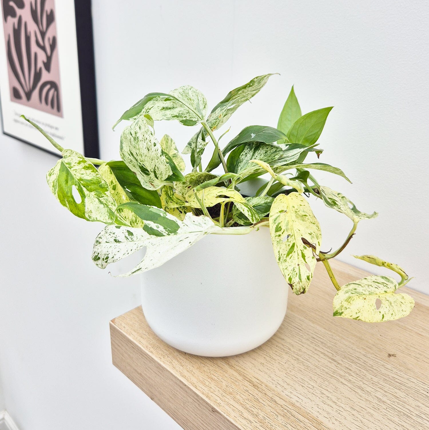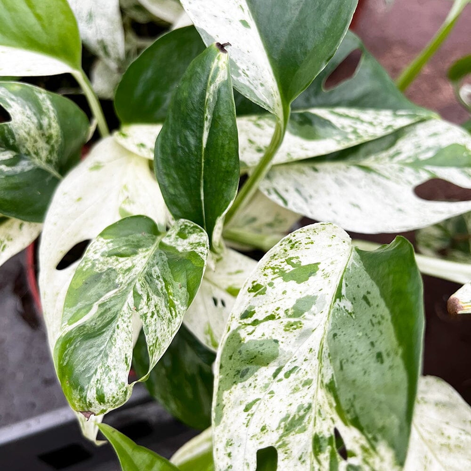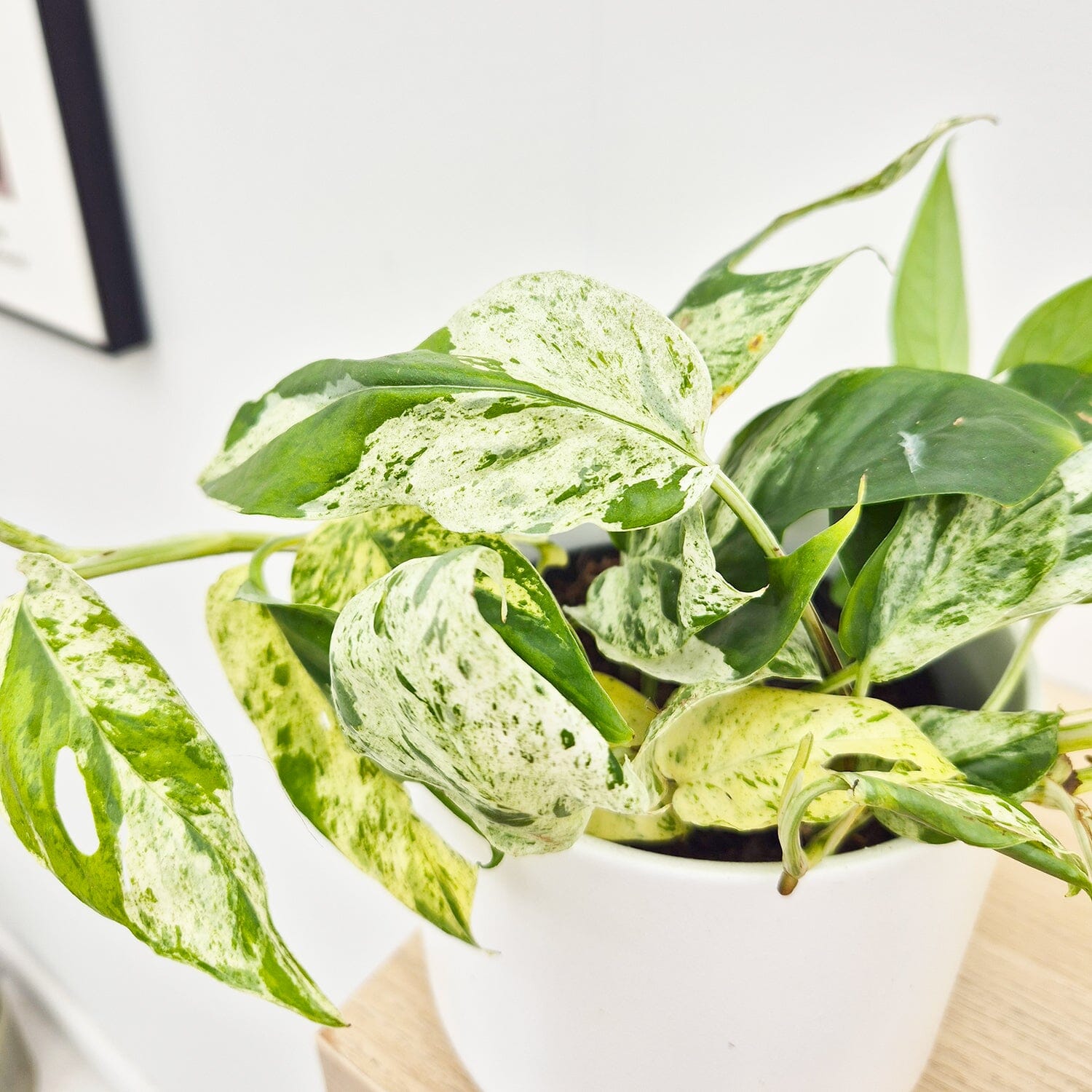 Each leaf is beautifully patterned with soft marbling — a delicate mix of creamy white, mint, and emerald tones, giving it the refined, marbled appearance that collectors adore. When allowed to climb, ‘Marble Variegata’ produces larger, more fenestrated (split) leaves similar in style to a Monstera, developing into a true showpiece of tropical beauty.