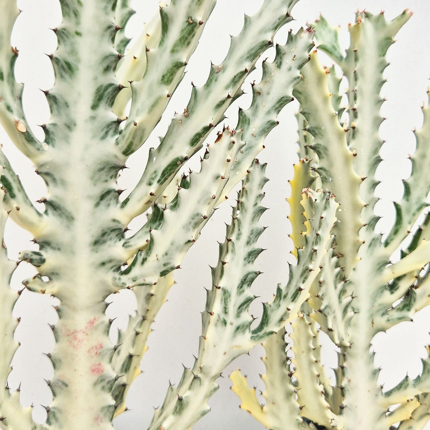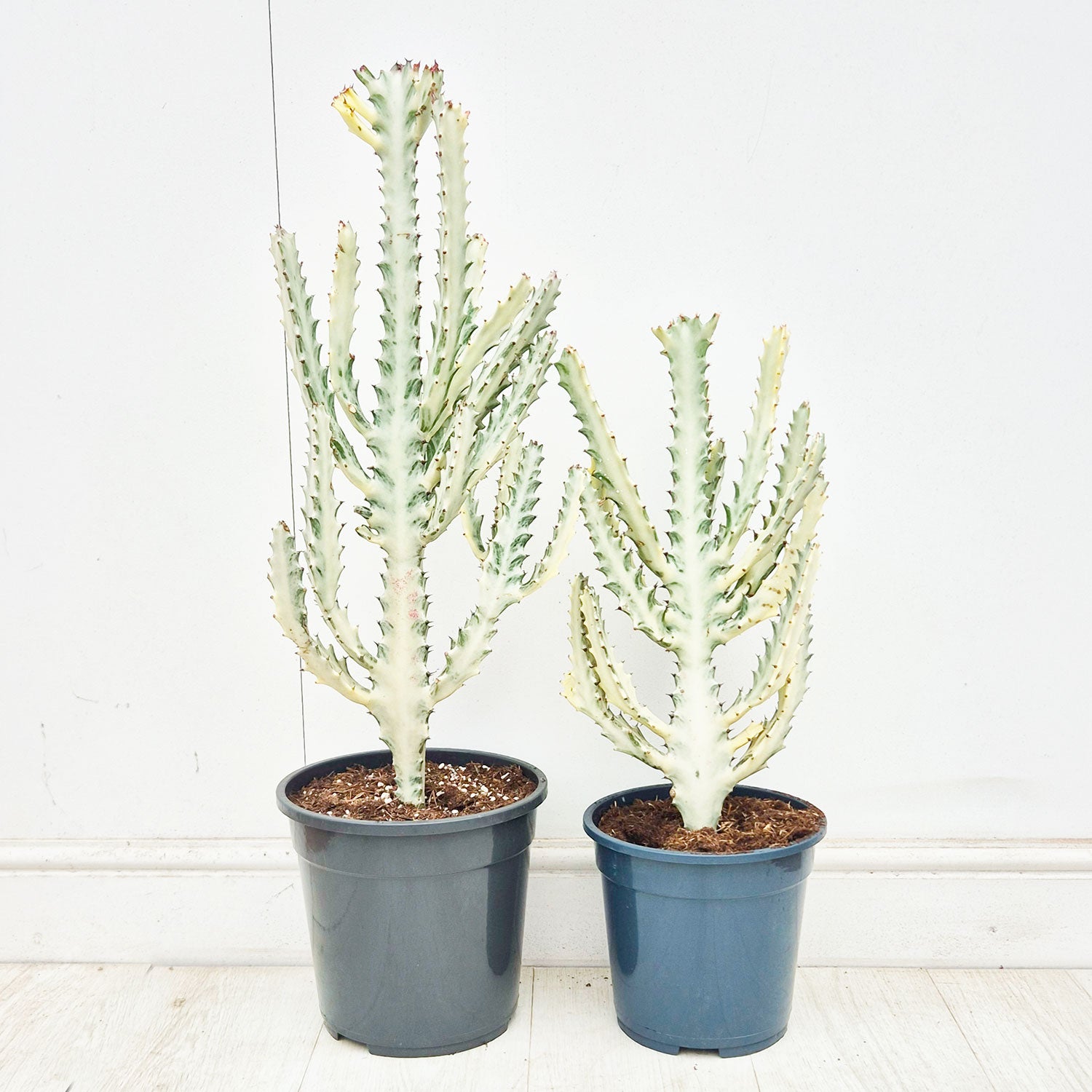 Unlike typical green Euphorbia lactea, the ‘White Ghost’ cultivar is characterised by its pale ivory to silvery-white stems, often marbled with faint hints of soft green, blush pink, or creamy grey. The upright, branching stems form a dramatic candelabra-like structure, with ridged edges lined by tiny thorns. Its stark, ghostly hue and striking architecture make it a living piece of modern art — ideal for contemporary interiors or as a show-stopping feature in bright, arid plant displays.