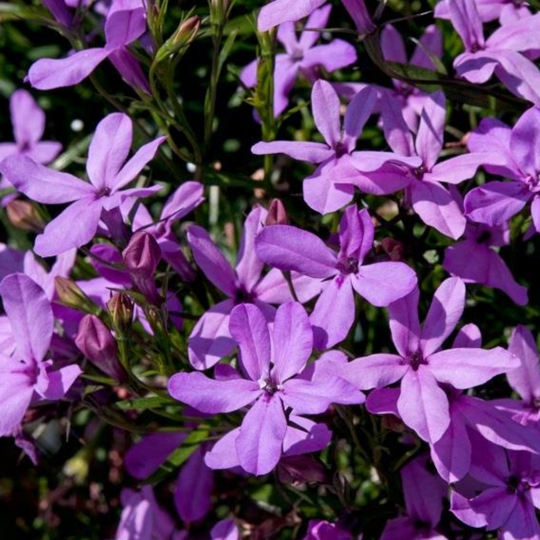 Upright lobelia produces masses of small, five-lobed flowers held closely together to form dense, dome-shaped displays above fine, bright green foliage. Available in rich blues, soft lavender, crisp white, and gentle pastel tones, these varieties offer strong visual impact despite their delicate flower size. Naturally bushy and floriferous, they’re ideal for containers, hanging baskets, window boxes, and the front of borders, where they add texture, colour, and lightness to planting schemes.