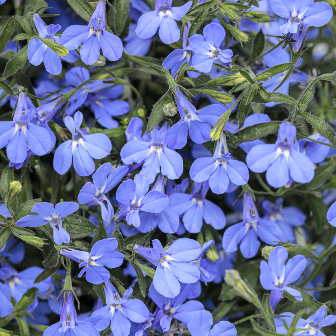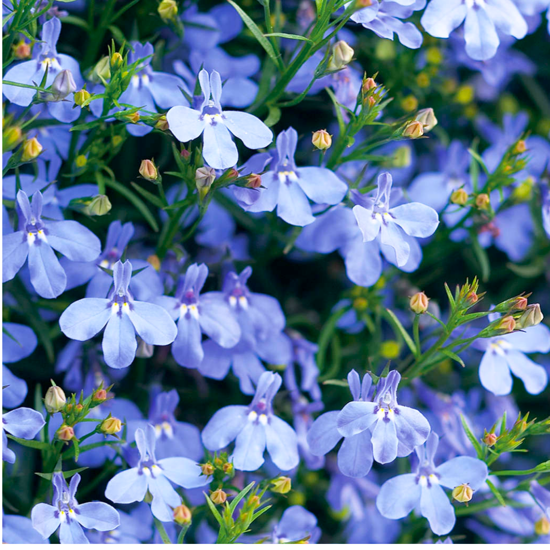 Upright lobelia produces masses of small, five-lobed flowers held closely together to form dense, dome-shaped displays above fine, bright green foliage. Available in rich blues, soft lavender, crisp white, and gentle pastel tones, these varieties offer strong visual impact despite their delicate flower size. Naturally bushy and floriferous, they’re ideal for containers, hanging baskets, window boxes, and the front of borders, where they add texture, colour, and lightness to planting schemes.