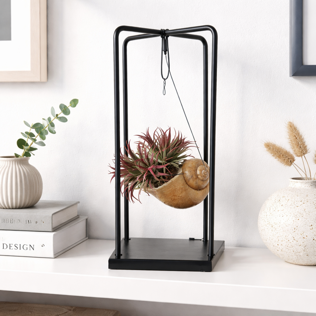 A Tillandsia air plant displayed in a sleek black cube frame is a modern, low-maintenance way to add greenery to your space. These sculptural plants don’t require soil, making them ideal for hanging displays, shelves, desks, or minimalist interiors. The contrast between the living foliage and the bold geometric frame creates a striking focal point that works beautifully in contemporary homes and offices.